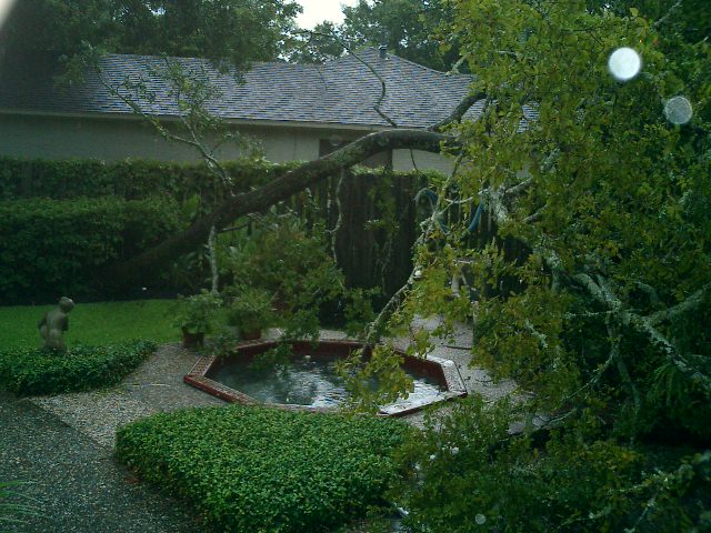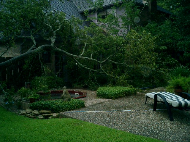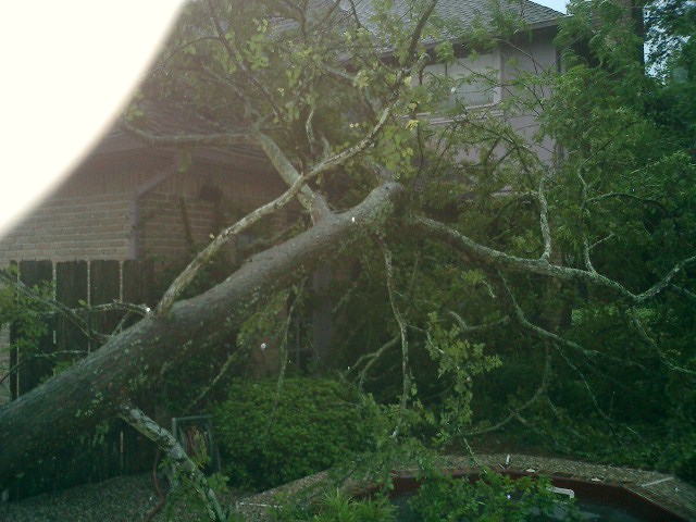 Our old elm fell on the corner of the house. It looked terrible from the study door.